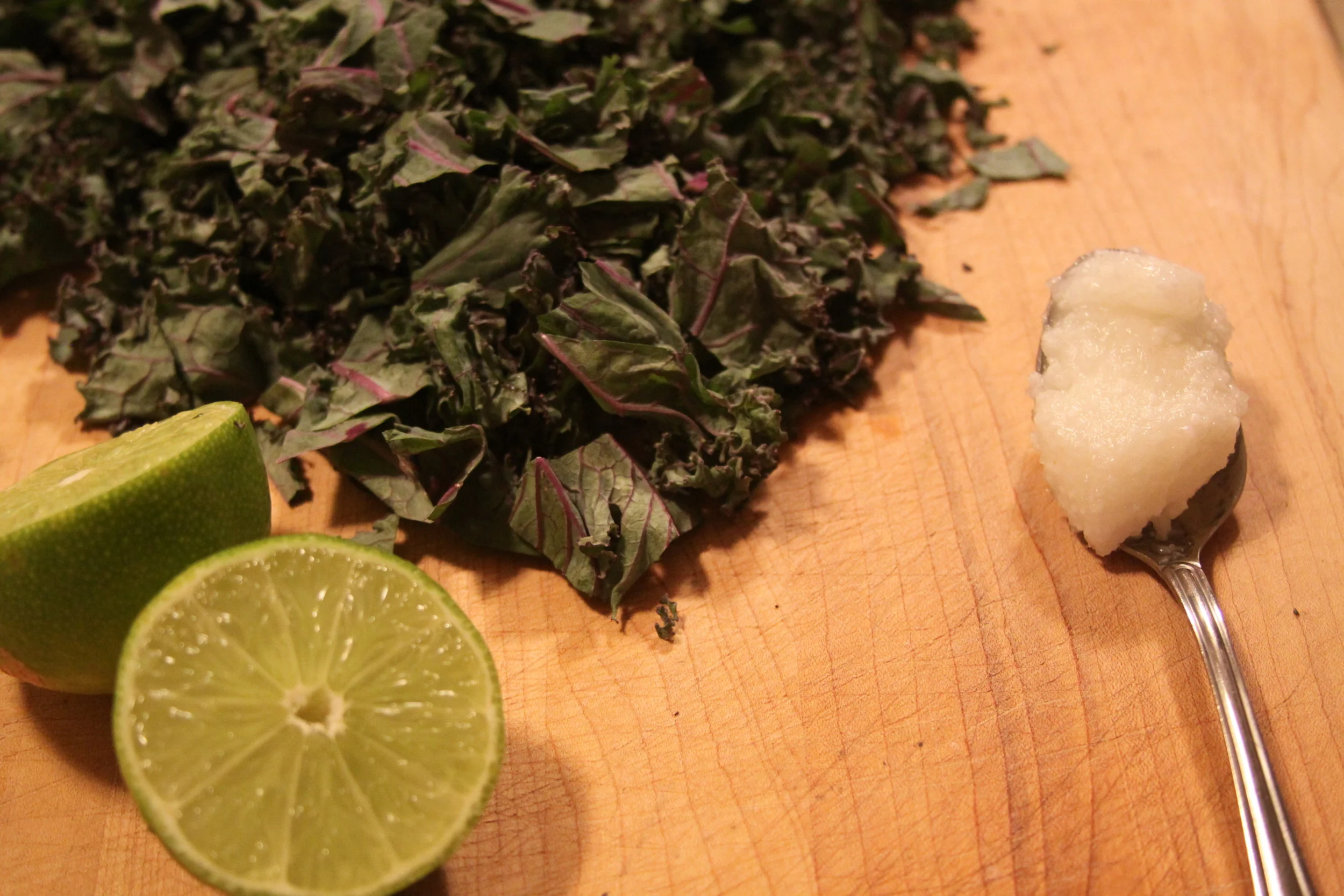 In the same sauté pan, add the vegetable oil and garlic. Toss in the chopped mustard greens and immediately add lime juice. Toss to coat. Add the coconut milk. Toss again and set aside when the greens are just wilted.