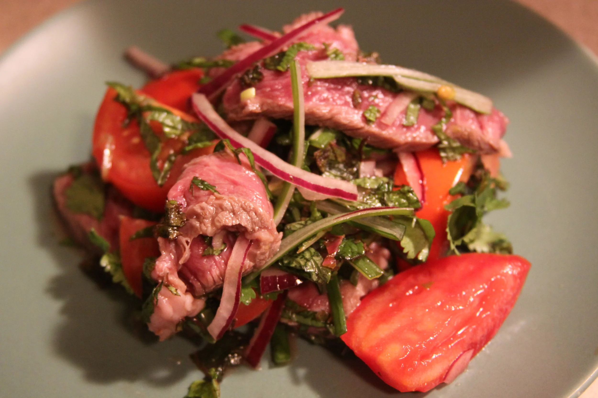 Spicy Thai Beef Salad with Wilted Coconut Lime Mustard Greens