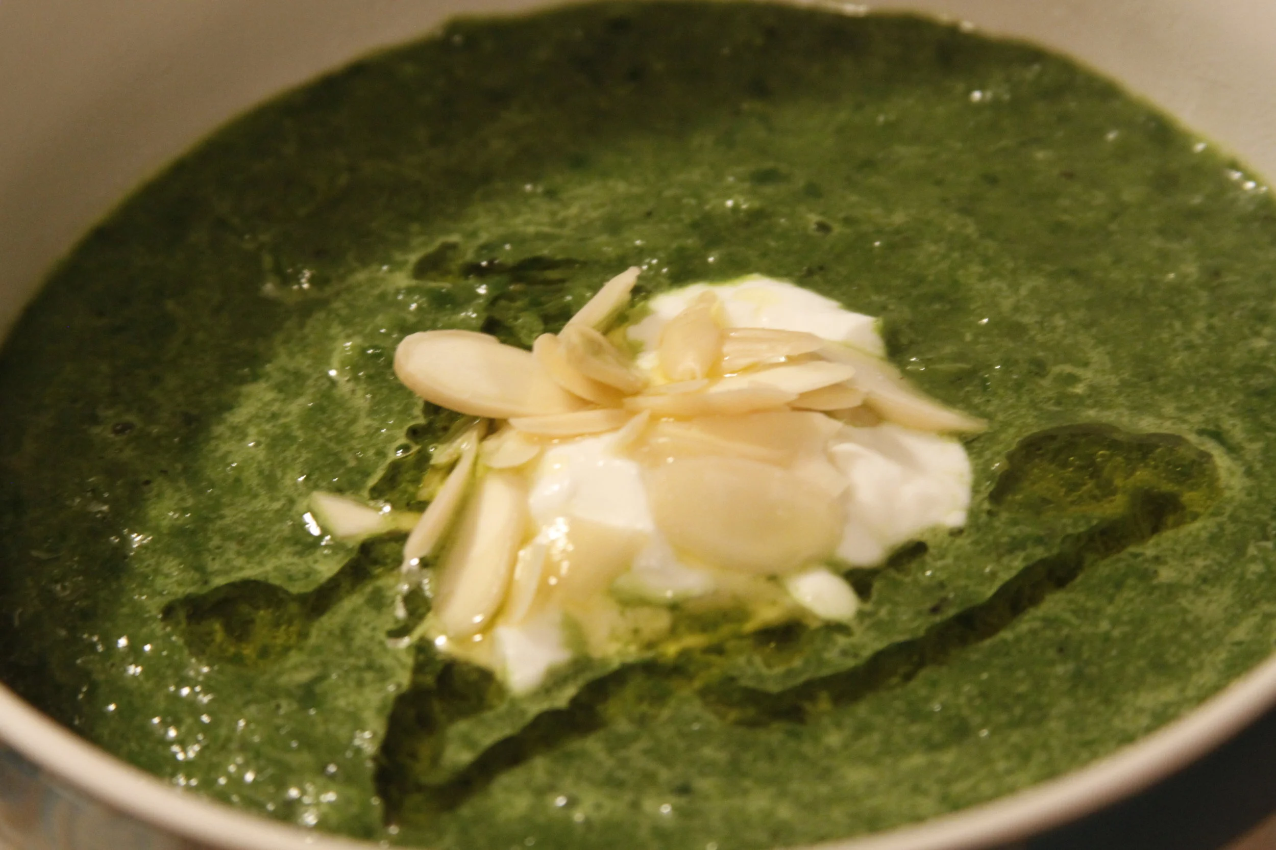 Chop the remaining poblano into ¼-inch pieces and add to the soup along with the other half of the potatoes. (You can reserve a tablespoon or two of poblano for garnish if you want.) Slice the remaining mustard green leaves into ½-inch pieces and add to the soup. When the soup has simmered for a minute or two—the mustard greens need to soften to a pleasant tenderness—season with salt, usually about 1½ teaspoons. If the soup seems a little thicker than you’d like, thin it with a little extra vegetable stock or water. Divide the soup among warm bowls and top each with a few pieces of poblano (and chopped toasted almond if you made extra).