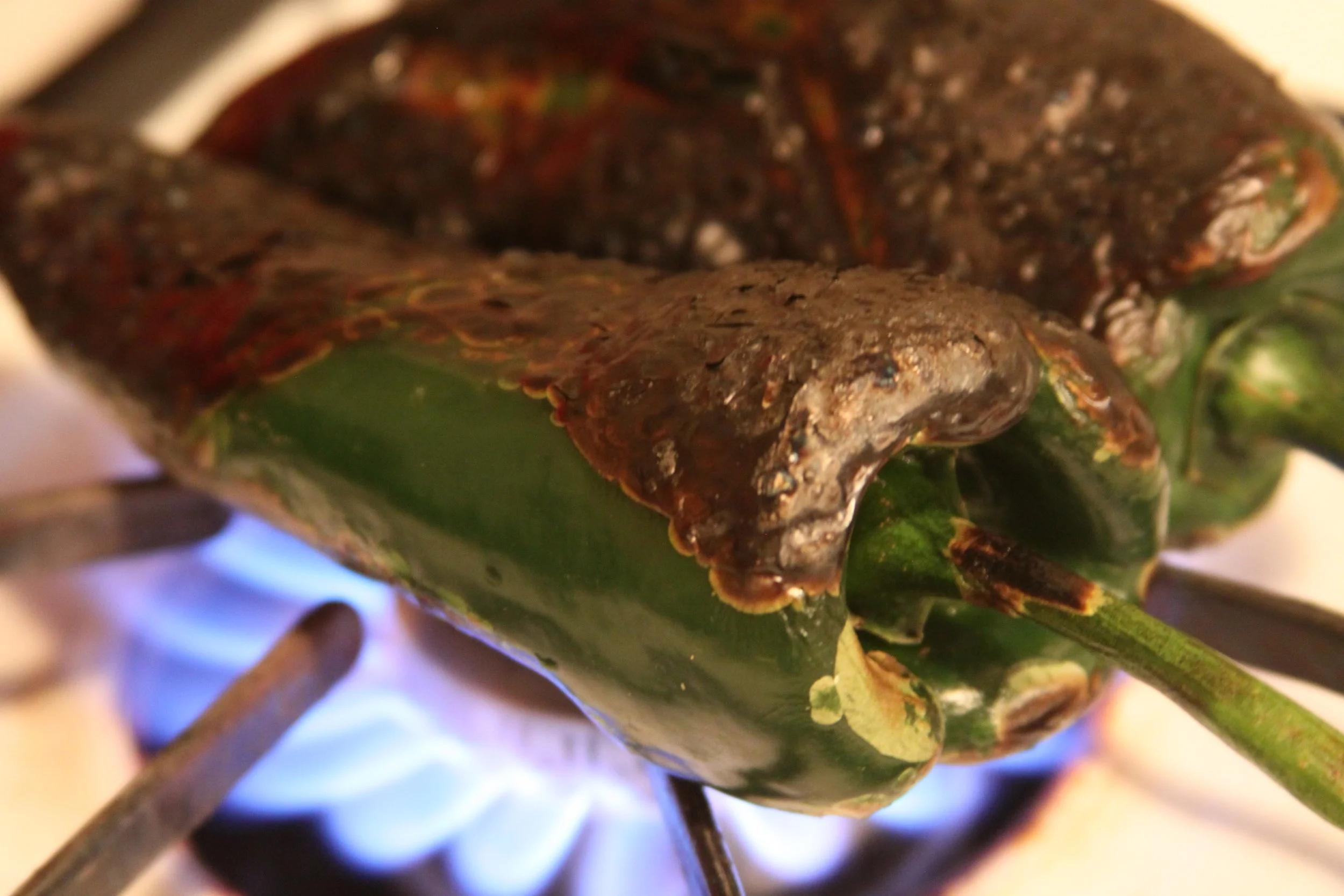 While the almonds are toasting, roast the poblanos over an open flame or close under a preheated broiler, turning regularly until blistered and blackened all over, about 5 minutes for the open flame, 10 minutes for the broiler. Place the chiles in a bowl, cover with cling film and cool. Remove the blackened skin off the chiles and pull out the stems and seeds.