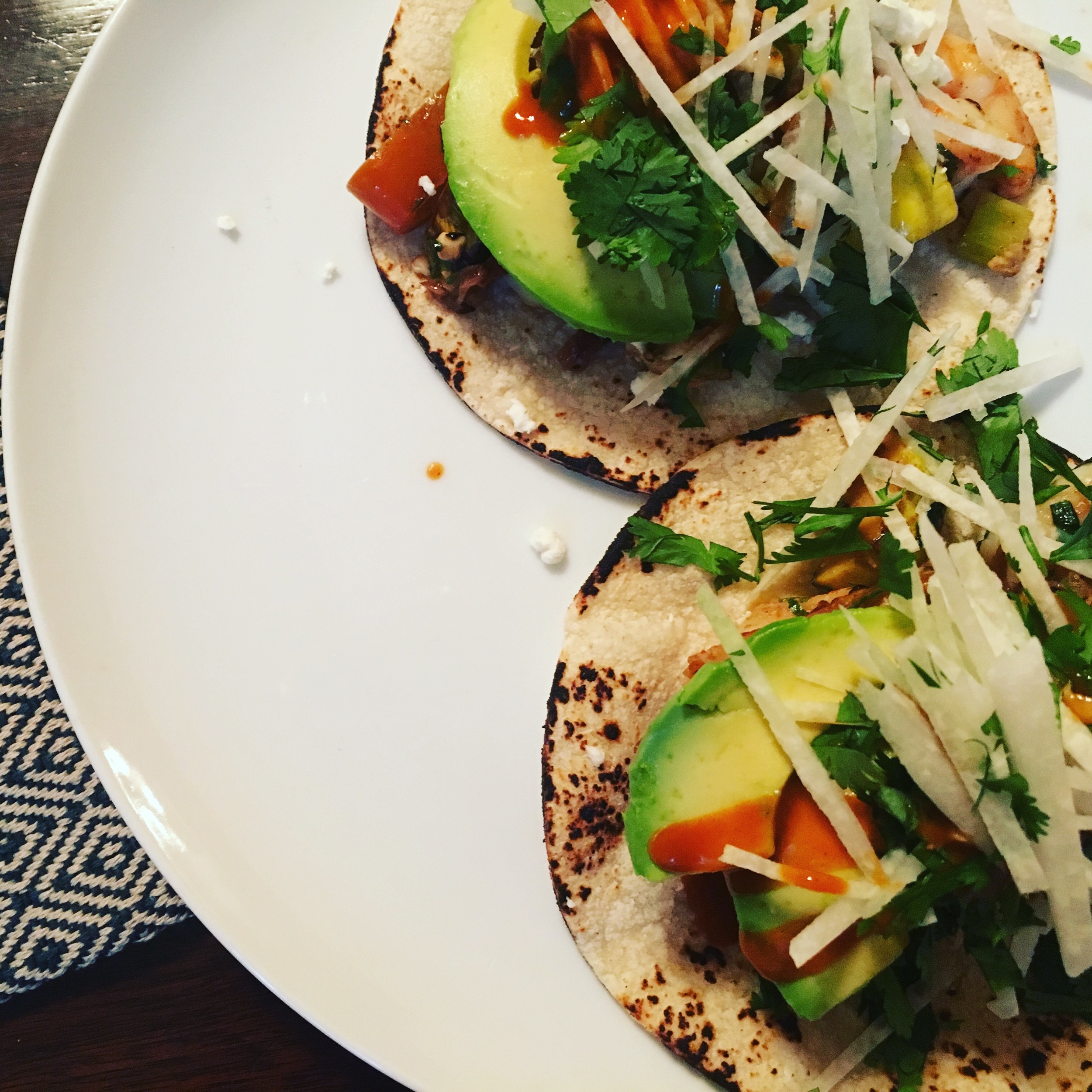 To serve, lay two tortillas down on a plate. Fill with squash mixture, top with jicama and serve with your favorite hot sauce.