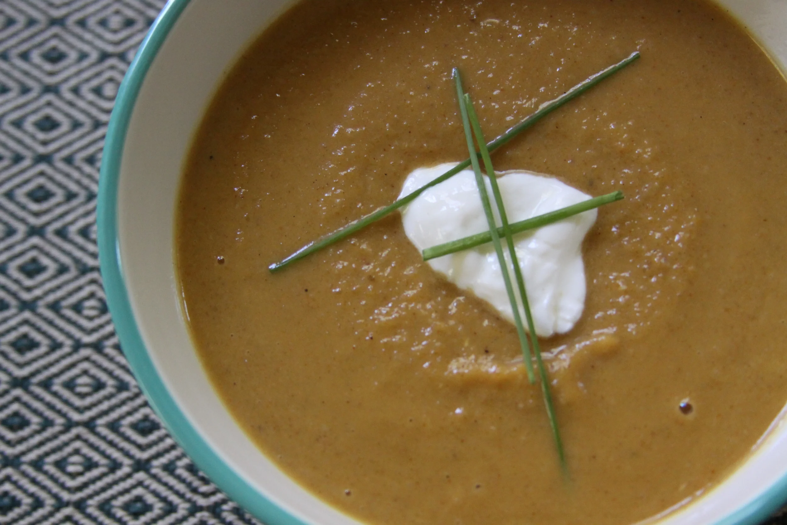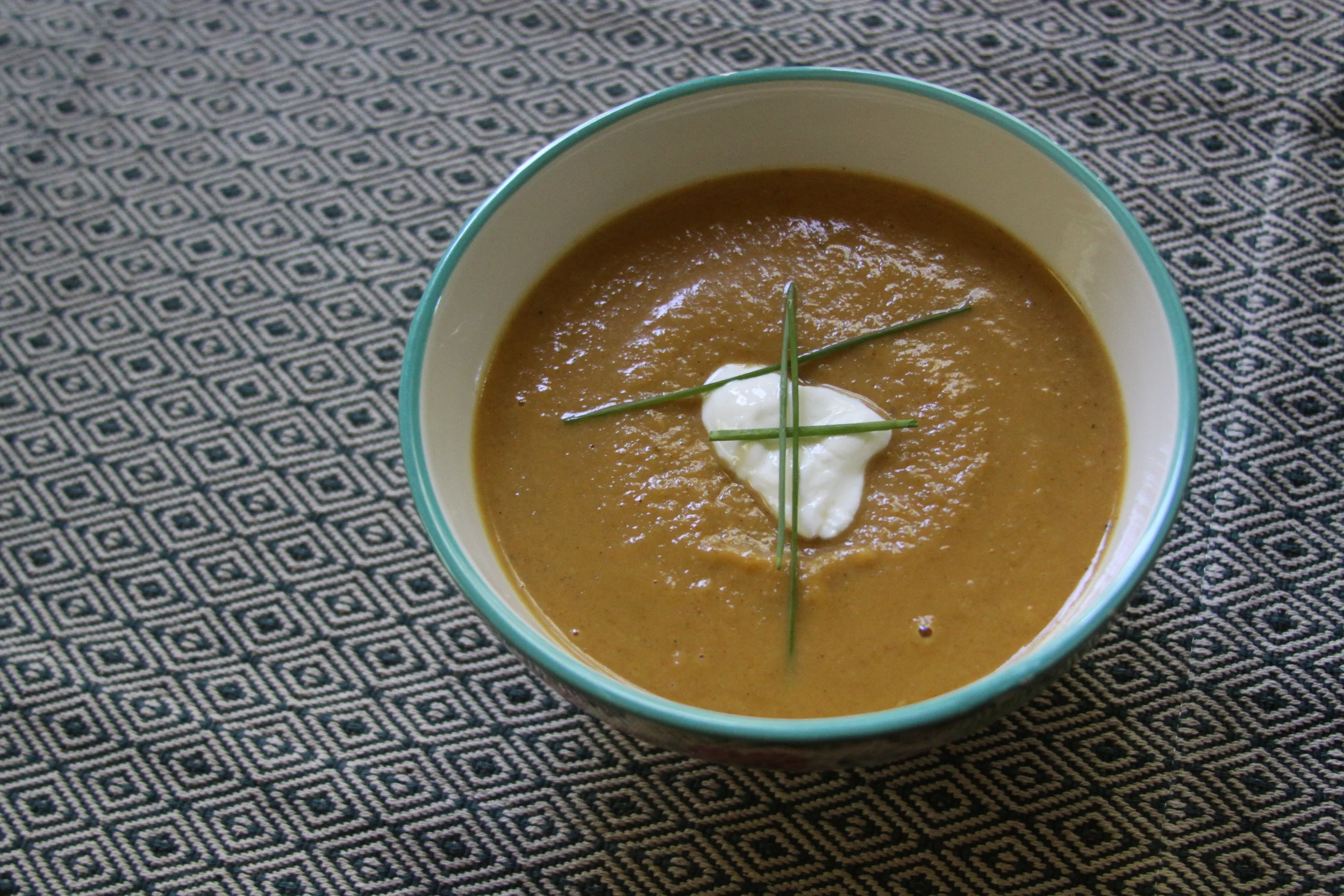 I've been saving the butternut squash I've been getting in my CSA from Green Gate Farms to make a big batch of gazpacho. I guess technically just a cold soup, this curried creation has the bright, tartness of lemon and tons of fresh garlic.