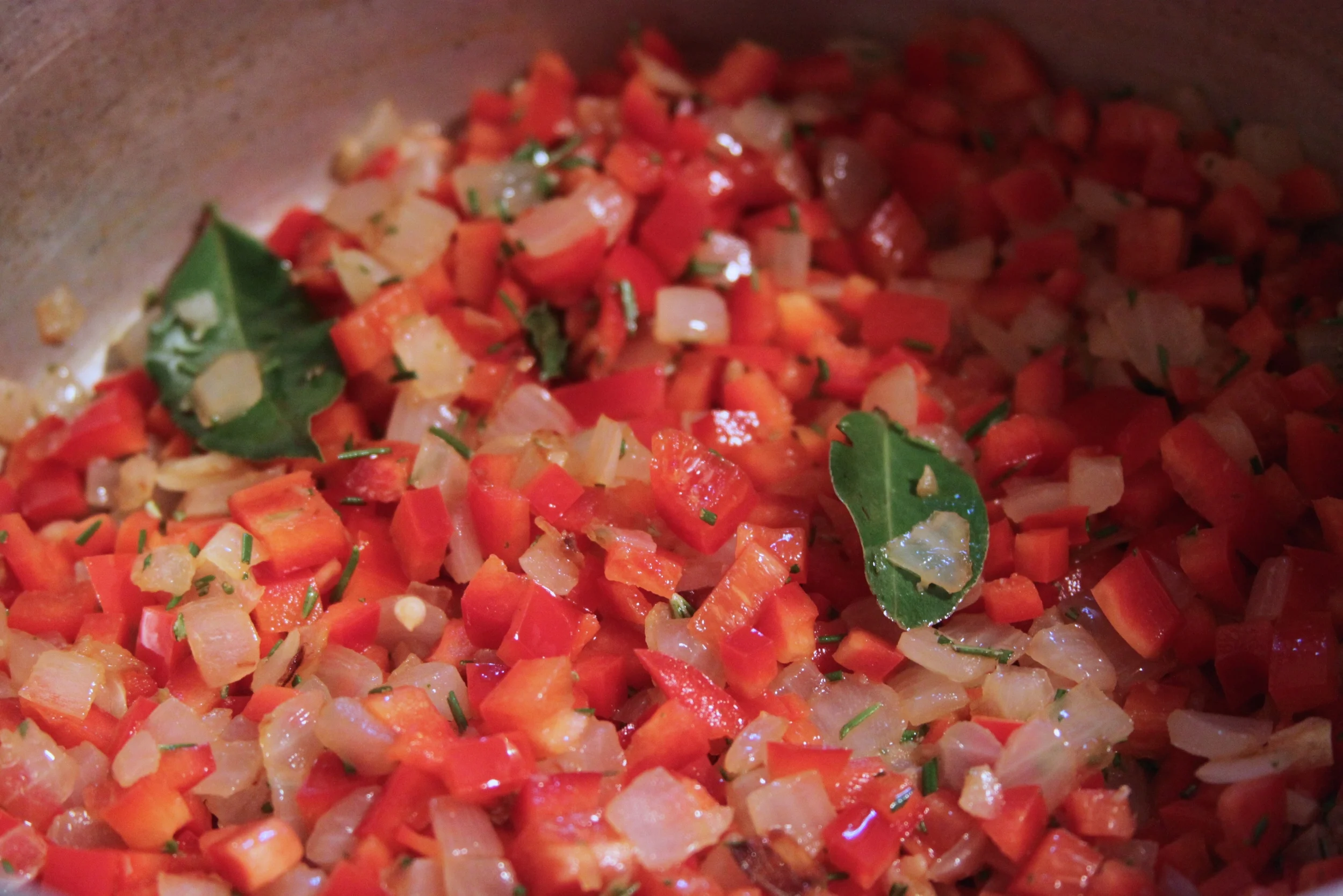 Add the garlic, rosemary, bay leaves and red pepper. When the pepper has softened and cooked for a further 10 minutes, add the paprika and tomatoes. Stir to combine and simmer for another 10 minutes. Then add the white wine and allow the alcohol to boil off for a few minutes. Add the fish stock and the saffron water. Stir to combine. Add the almonds and vinegar and stir again.