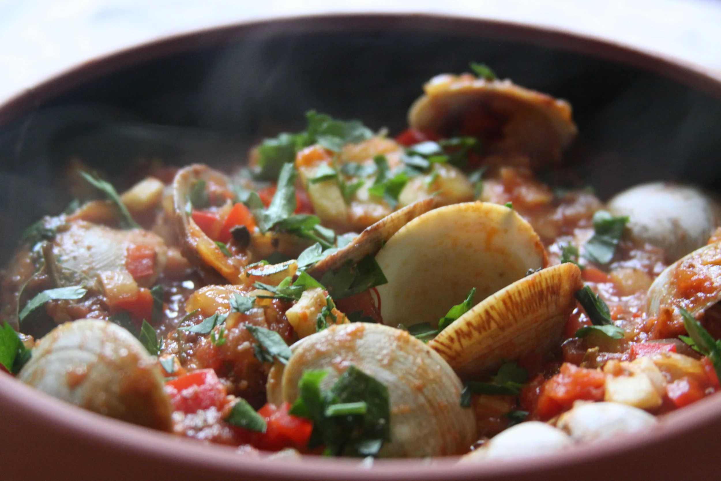 /Catalan fish and clam stew with ground toasted almonds and saffron.