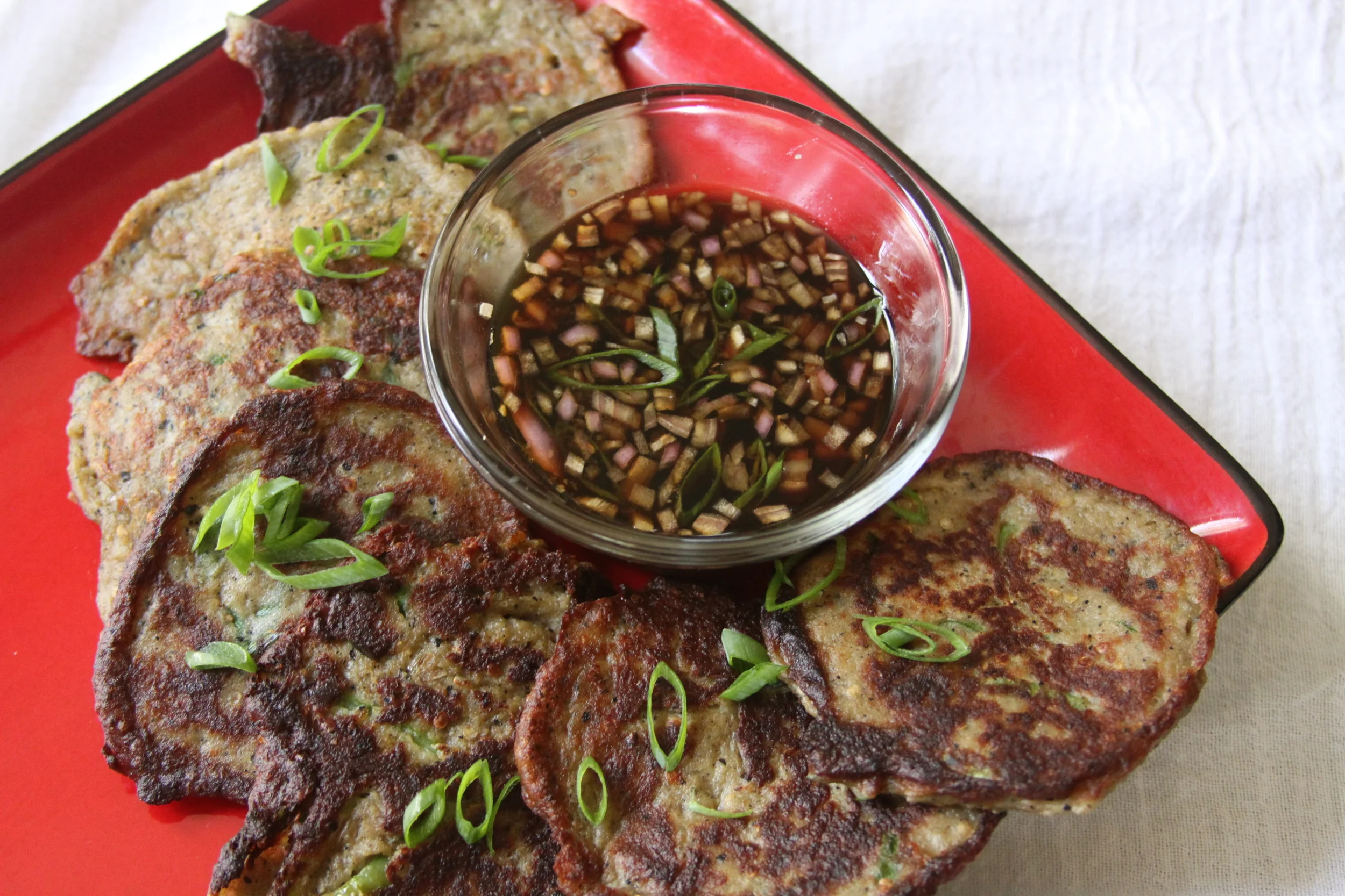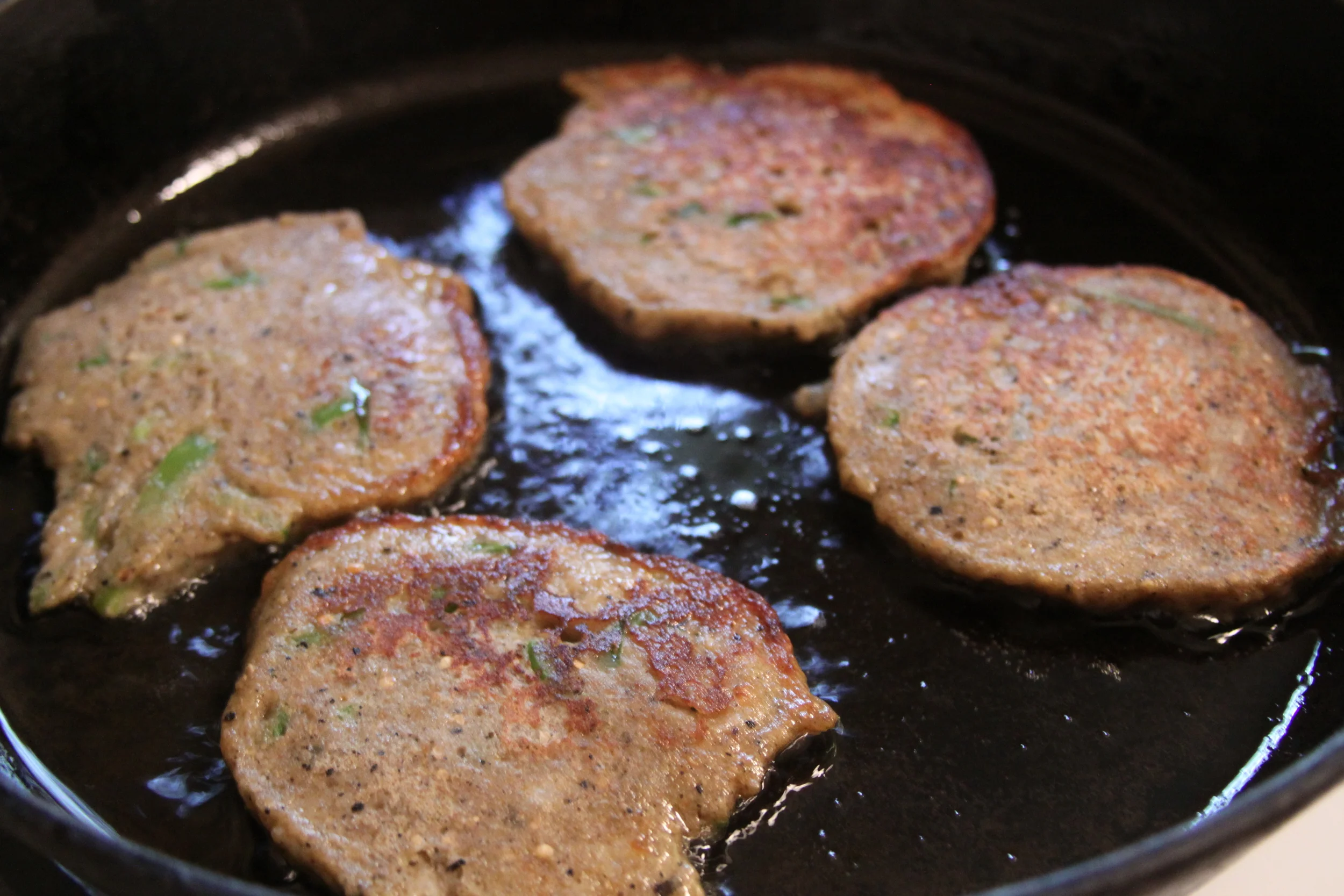 In a pan, add half the olive oil over medium high heat. The batter will be thick so you will need to spread the pancakes out with a spoon. If you'd rather you can add a little more water to thin the mixture.