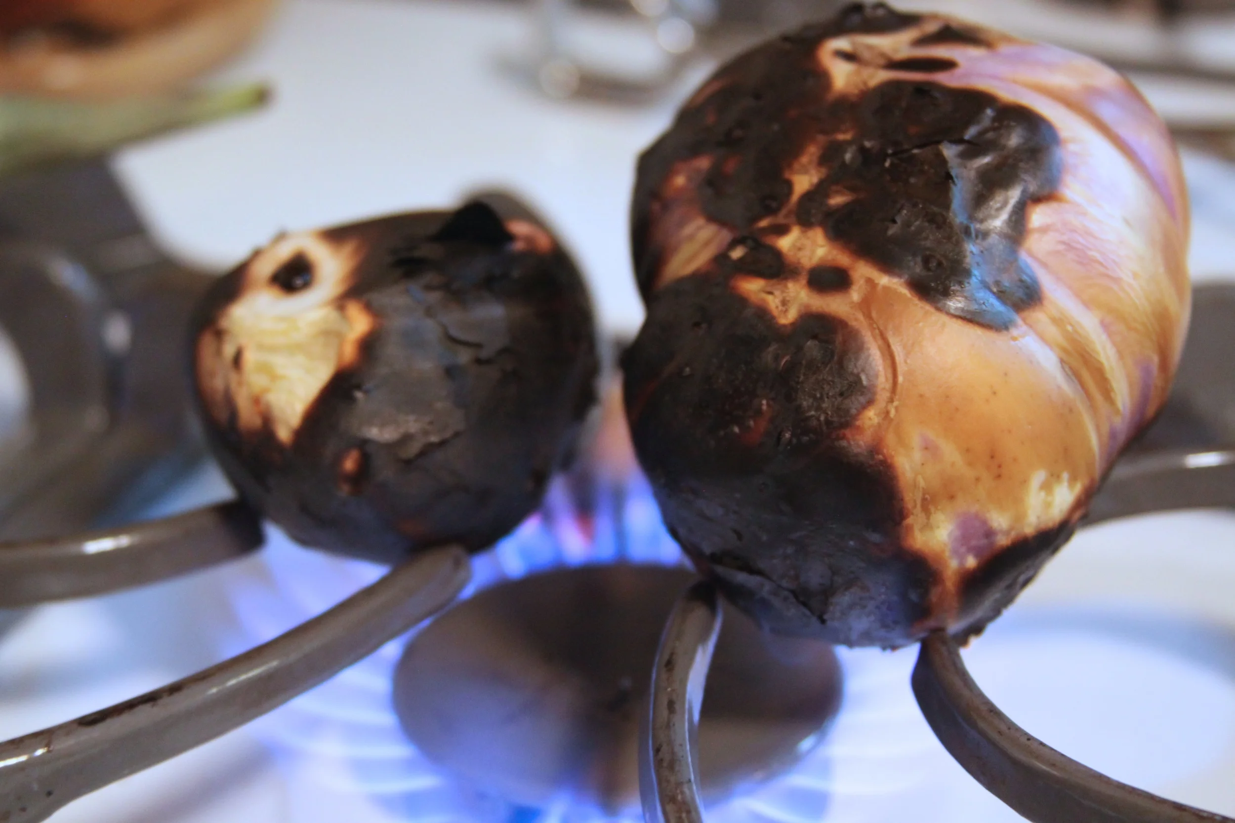 Over a high flame, set the aubergines to char. Once completely blackened, set in a bowl and cover with a plate and allow to rest until cool. Peel and pulse in a food processor or blender and set aside.