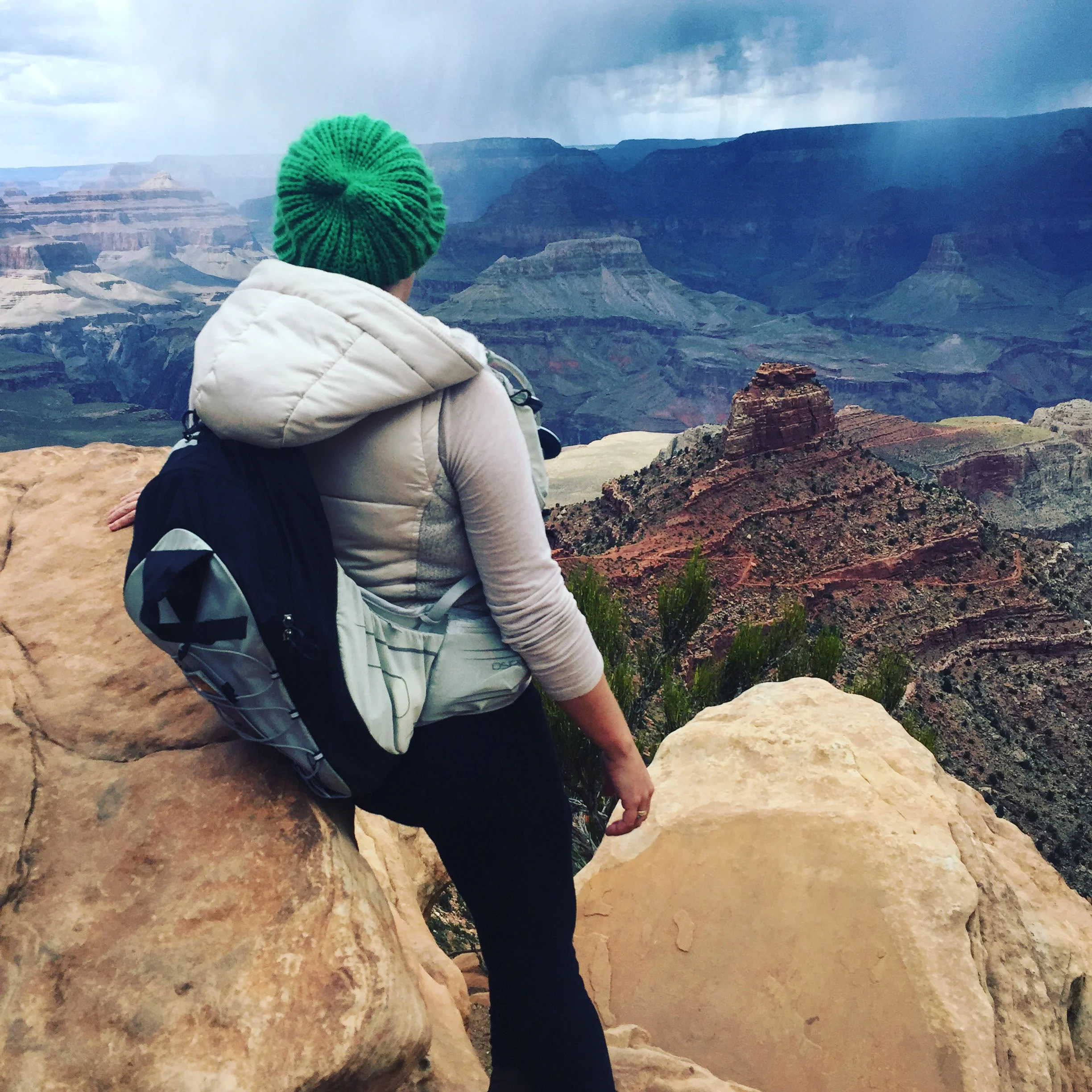 Day two was devoted to the Grand Canyon. I hadn't visited since my father took us there around 1994 to see a killer meteor shower. We decided on the South Kaibab trail on the South Rim of the Canyon. From this trail, you can hike all the way down to the river though it is highly recommended that you plan to camp at least one night before returning up the trail. Though Skeleton Point is only 3 miles down, it is suggested that you do not attempt to hike past this point if you intend a single day hike. Why? The trail is steep and while going down is easy, coming back up is much more of a challenge. Also note that there is no water on the way down so bring plenty with you. Luckily I borrowed a friend's Osprey water pack which we filled and drank from throughout the hike. We hiked to the Ooh Aah point - only a mile down! It was still an incredibly challenging and rewarding hike! There were storms rolling in across the canyon bringing rain and loud bursts of thunder. I was wearing a down vest and a hat - which I would recommend due to the sun and wind. This hike took us about 2 hours. If you plan to go further, it is imperative that you not only bring water but some salty snacks for the walk. Despite the relatively cool temperatures that day, we were sweating a lot. There are lots of stories of people who hike unprepared and suffer the consequences - heatstroke, dehydration, and in the extreme cases, death. Hike smart!