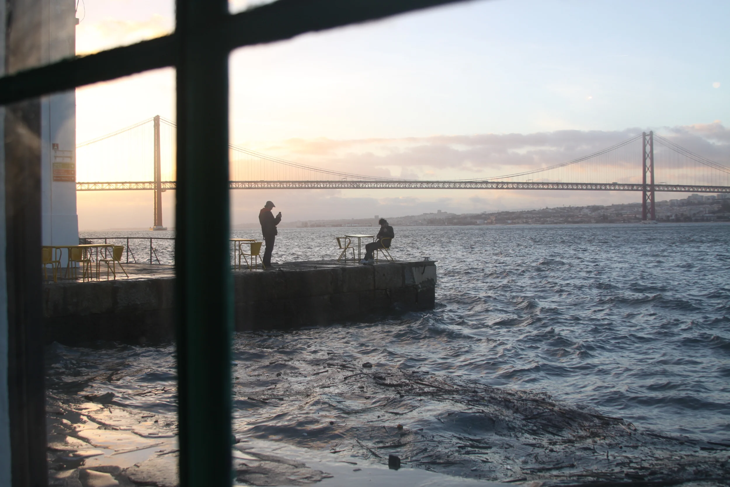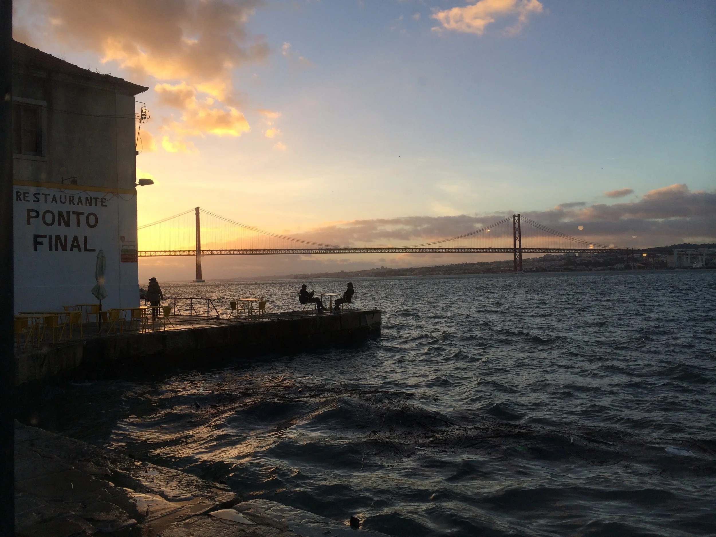 From the drop off point at Cacilhas station, follow the road to the right. The wide concrete path leads you right along the water, the waves of the river crashing up over the walkway on one side and on the other, the crumbling facades of derelict buildings delight with beautiful graffiti. All the while in the distance, silhouetted in the light of the sunset, is the beautiful 25 de Abril Bridge (Ponte Salazar), a suspension bridge reminiscent of the Golden Gate.