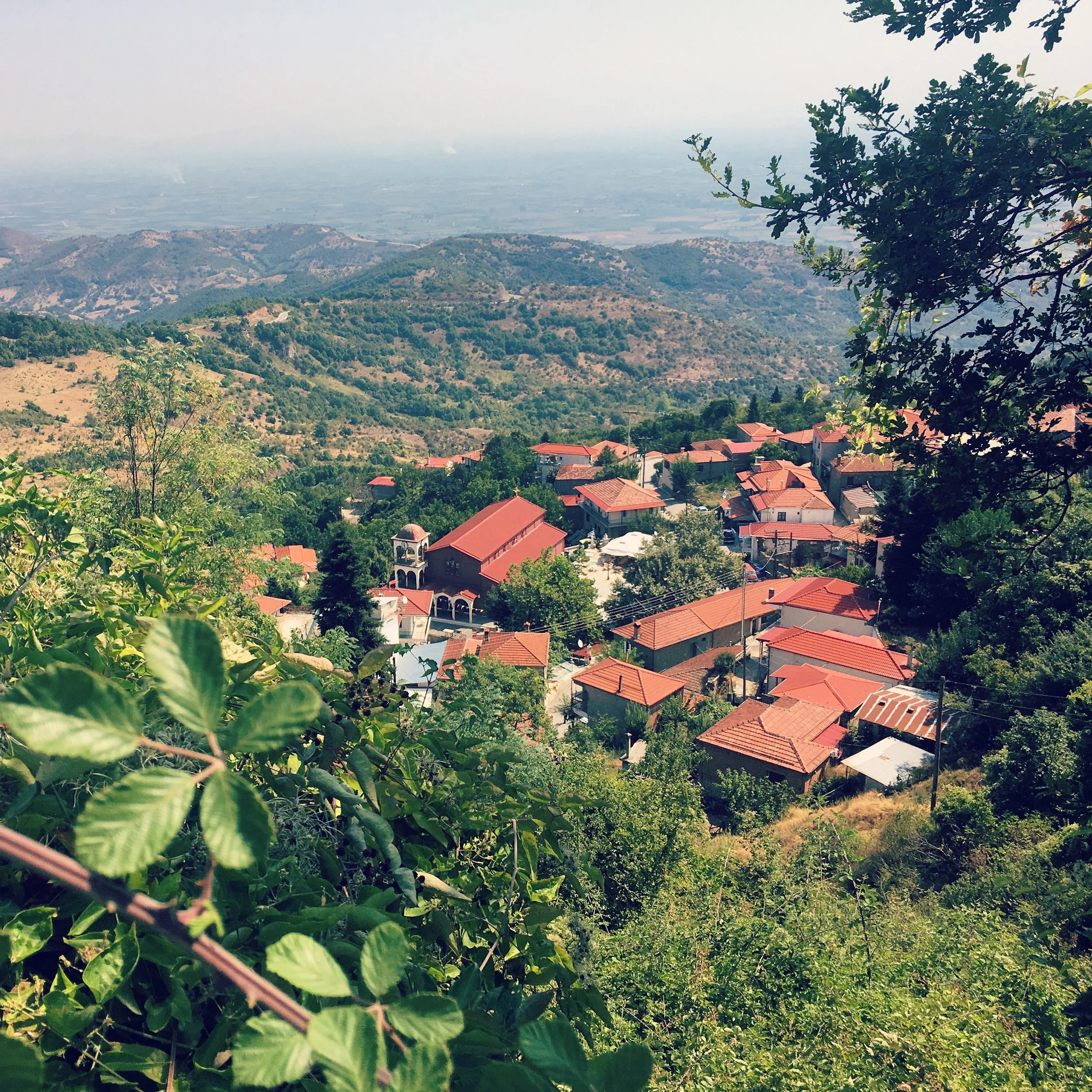 /Our third day in Greece we headed to Meteora (a day early because the forecast was predicting thunderstorms). On the way, we stopped in Morfovouni, a small village set along the steep slopes of a mountainside near Limni (lake) Plastiri. We hiked up to the top of the village from the church square below and then returned for lunch at Taverna Plastiras for roasted lamb and aubergine stew. Fantastic meal! We sat in the church square and watched a group of village boys playing football, using lampposts and trees as goalposts. As it was a Sunday afternoon, all the men in the village were gathered at the various cafes and taverns on the square to smoke, drink coffee and chat.