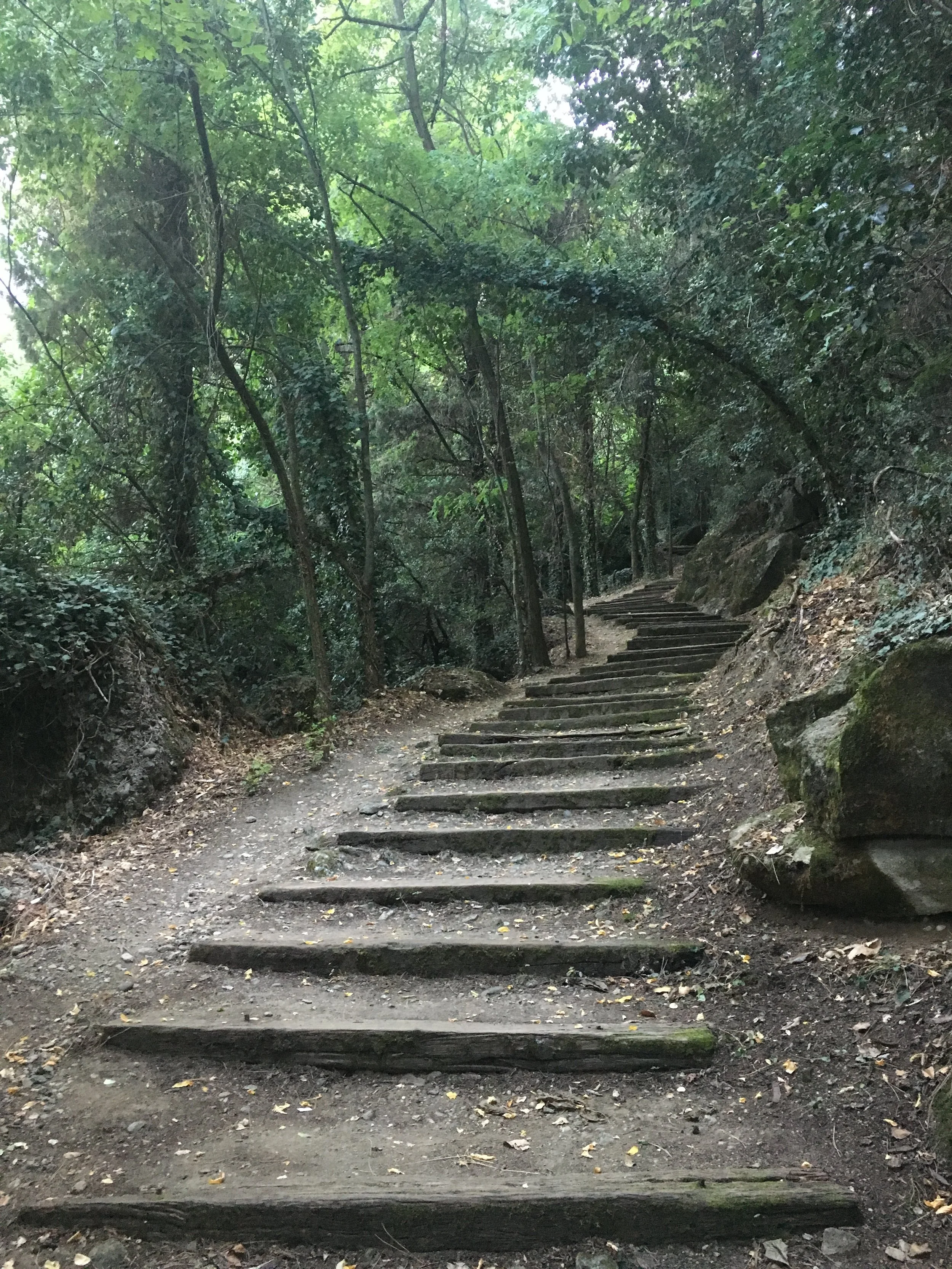 Our first morning we helped ourselves to the free buffet at the hotel. We filled up our bottles with plenty of water and headed out with extra fruit to Kastraki. Our first hike started at the easternmost side of the town with the small church Agios (Saint) Nikolaos, not to be confused with the monastery atop a peak of the same name. This one sits nestled between the pillars Pixara and Surloti. We parked near the town square and headed in what we thought was the right direction. We could see the church above the houses so we had a general idea. We passed beautiful little houses and gardens along the way and then hit a dirt road that headed up the hill to the church. Here, the road splits, one heading up to the left will take you to Nikolaos and another church higher up, Panagia. The other, to the right, wraps around the rock formations taking you below inhabited caves or hermitages carved into the great rocks. Just after Nikolaos, the trail transforms from a dirt road to a wood beam staircase, taking you through the shady forest above. The darkness and tranquility reminded me very much of the temples of Japan.