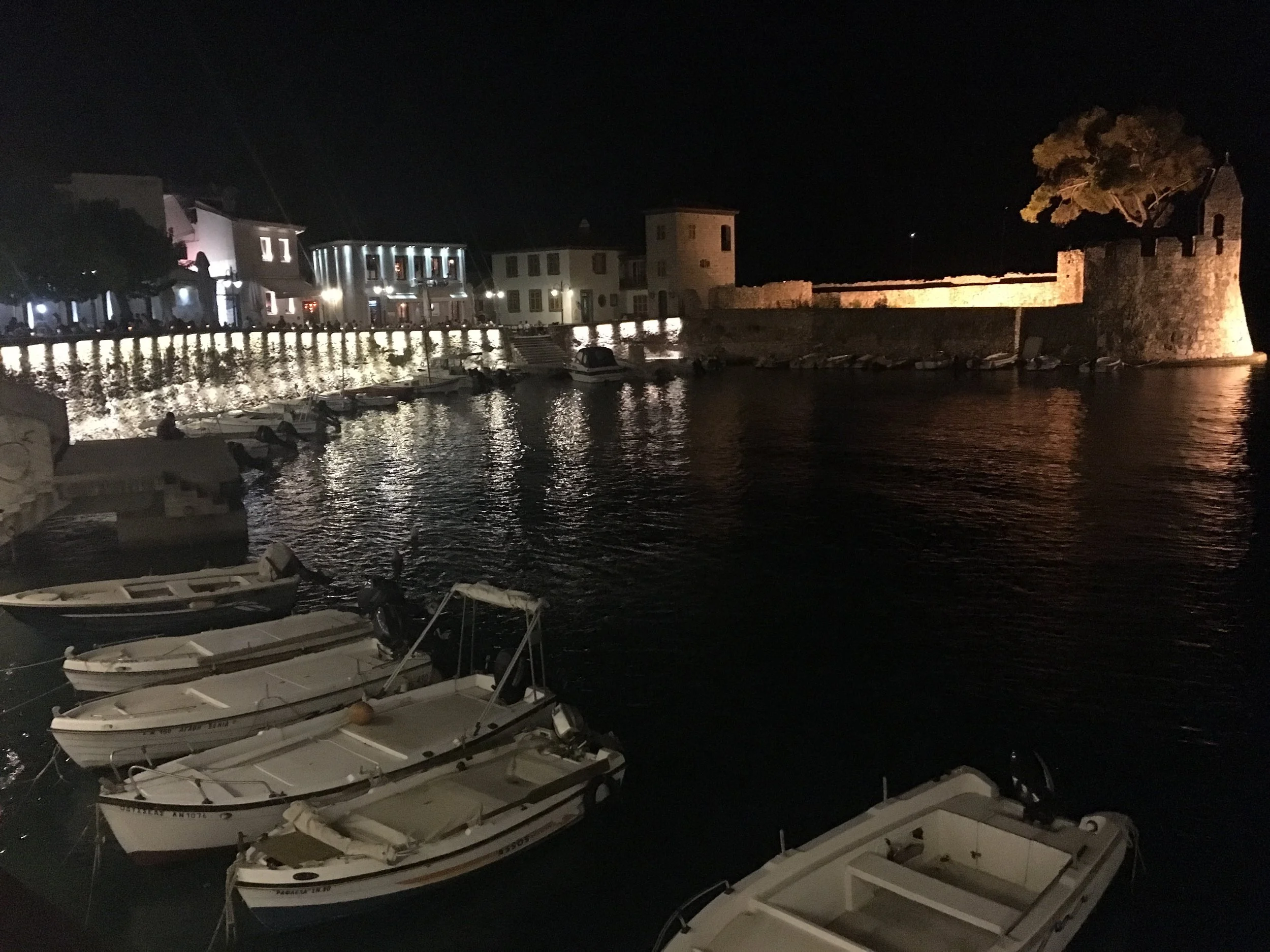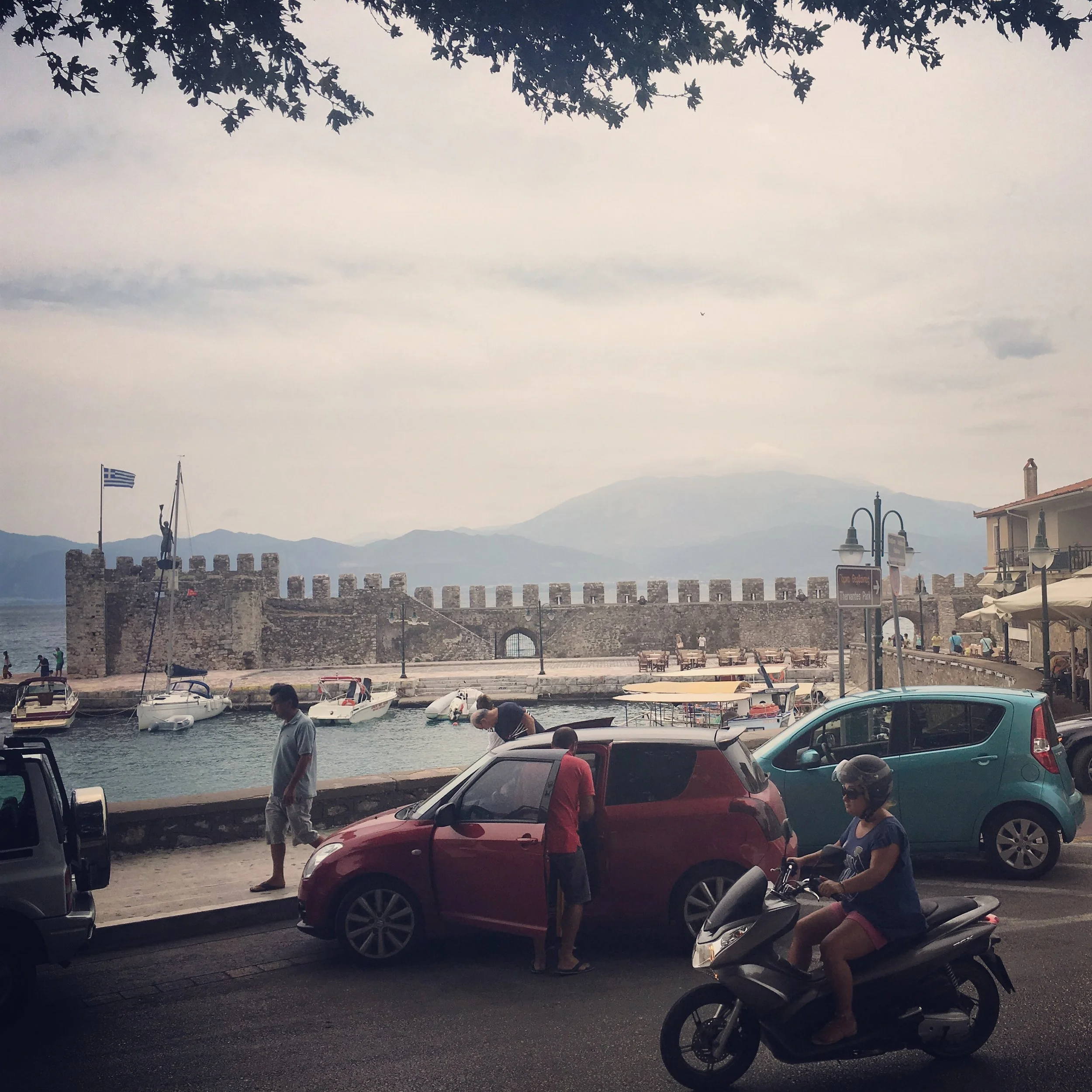 Nafpakto or Nafpaktos is a larger city on the Gulf of Corinth. We stopped in to see one of Dino's childhood friends at the beautiful jewelry shop she owns with her husband. We stayed at an unassuming little hotel on the beachfront and napped before heading out with Maria and her husband to a little seaside seafood restaurant for huge prawns, grilled fish, fried zucchini, salad and new-to-me phykos, a local seaweed sautéed in garlic and olive oil and served with lemon.